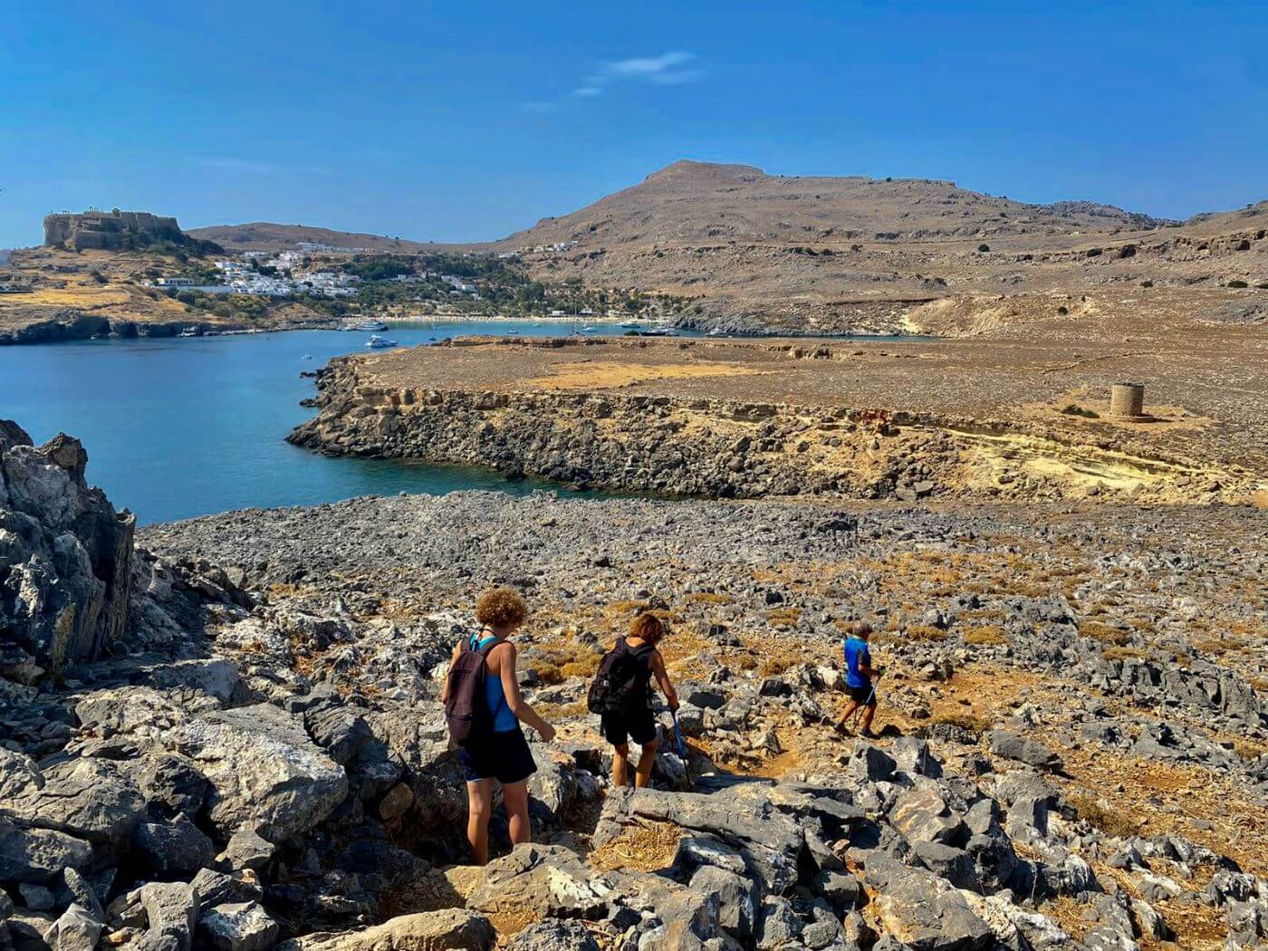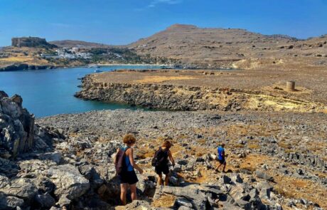 La partenza si trova sopra la baia di Vlycha e prosegue attraverso un suggestivo ambiente roccioso. L’avventura continua su un sentiero leggermente in salita, contornato da rocce, dove la presenza degli asini fa da compagnia. La vista poi si apre su un punto panoramico sulla Baia di Navarone, famosa per il film “I cannoni di Navarone”. Dopo qualche centinaio di metri si potrà ammirare dall’alto l’Acropoli che domina il tipico paesino bianco di Lindos, conosciuto come “la perla del Dodecaneso”. Da qui in poi la discesa, che si svolge lungo un sentiero talvolta impegnativo, per poi attraversare il paese e proseguire verso l’Acropoli, la tomba di Kleovulos del VI secolo a.c.  e torna poi alla baia di Vlycha, il nostro punto di partenza, per un meritato bagno riposante.