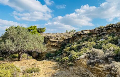 Il trekking parte dal paese di Archangelos e prosegue tra uliveti e vegetazione che si fa sempre più fitta grazie a innumerevoli varietà di piante. L’intera area, ricca di sorgenti, rende “Epta Piges”, una piccola oasi rinfrescante. Il sentiero continua costeggiando il fiumiciattolo, passando per un’antica diga e risalendo fino ad arrivare alle famose sette sorgenti. Qui troverai papere e pavoni ben lieti di farsi ammirare e fotografare. Potrai poi provare l’emozione di attraversare uno stretto e suggestivo tunnel con l’acqua fresca che ti bagna i piedi . Dopo una breve sosta di ristoro, la camminata prosegue nel bosco, percorrendo un avventuroso sentiero e allontanandosi dalle sorgenti per immergersi nei campi di ulivi. Poco a poco la generosa vegetazione va via via diradandosi facendo spazio a un paesaggio brullo caratteristico della zona di Archangelos.